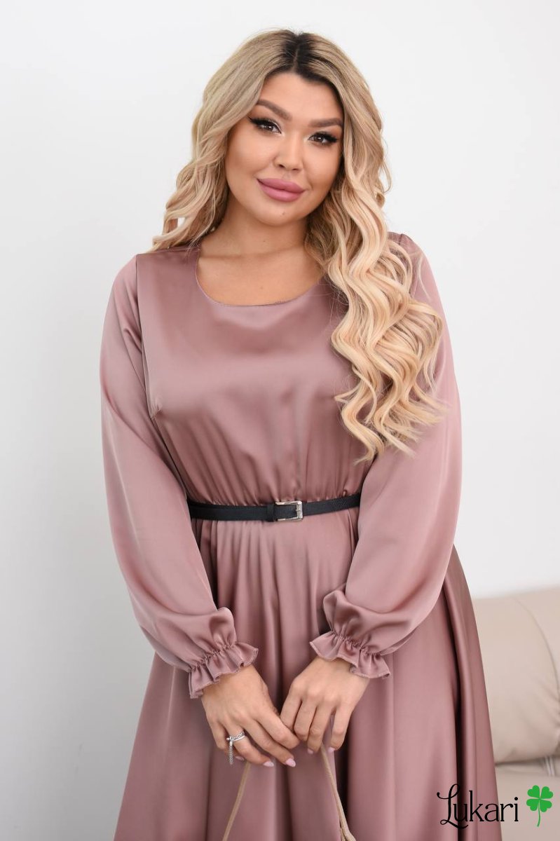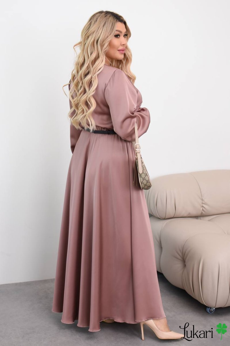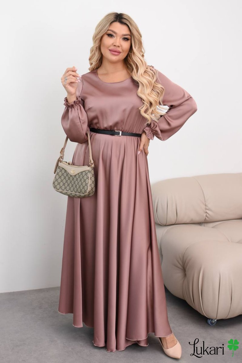 Довга сукня з королівського шовку мокко з поясом, великі розміри ДМЛК 4475-3