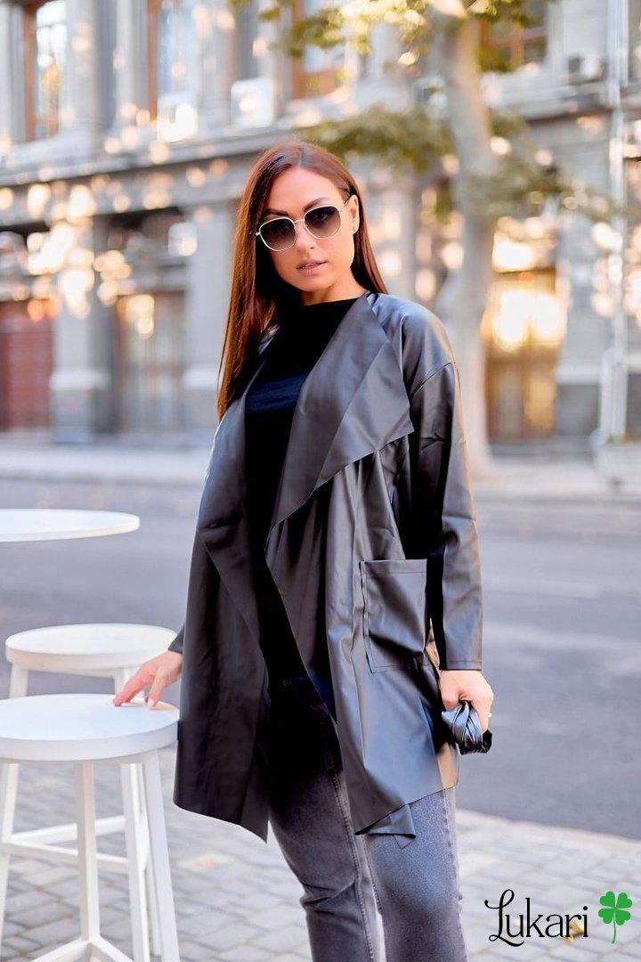 Кардиган с ассиметричным низом и накладными карманами из турецкой эко кожи приятной к телу.