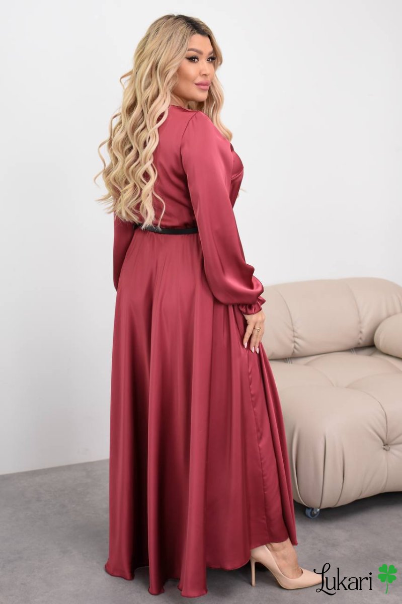 Довга сукня з королівського шовку бордо з поясом, великі розміри ДМЛК 4475-1