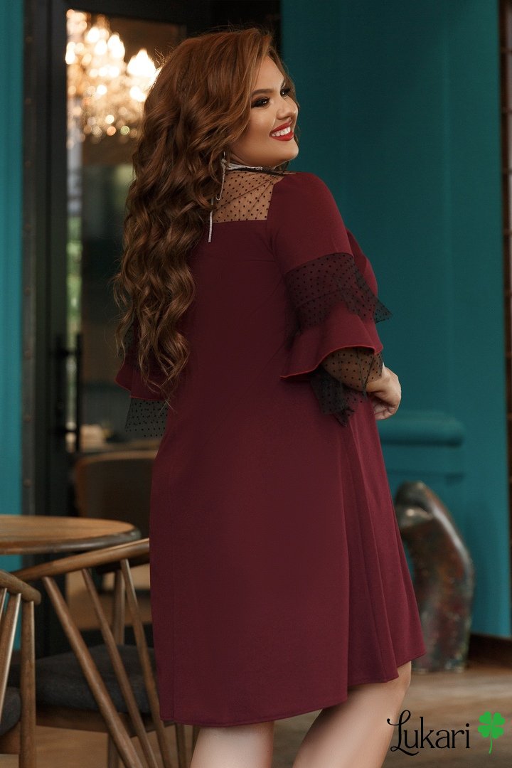 Модель имеет свободный, трапециевидный крой, сглаживающий все шероховатости фигуры, и классическую длину до колен. В качестве акцентов здесь использованы красиво оформленные рукава с воланами, в комбинации с сеткой в горох, а также вырез горловины из сетки. Такие детали существенно преображают некоторую строгость модели, что позволяет создать очаровательный милый образ.