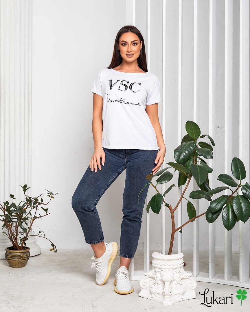Стильна футболка з бавовняної тканини - прекрасна база для повсякденних літніх образів. Модель вільного силуету дозволяє тілу дихати і відчувати себе комфортно спекотним днем. Футболка з суцільнокроєним коротким рукавом, круглим вирізом горловини. На грудях модний якісний накат, додають яскравості та оригінальності образу. Футболка легко комбінується з джинсами, шортами і спідницями з літнього гардеробу.