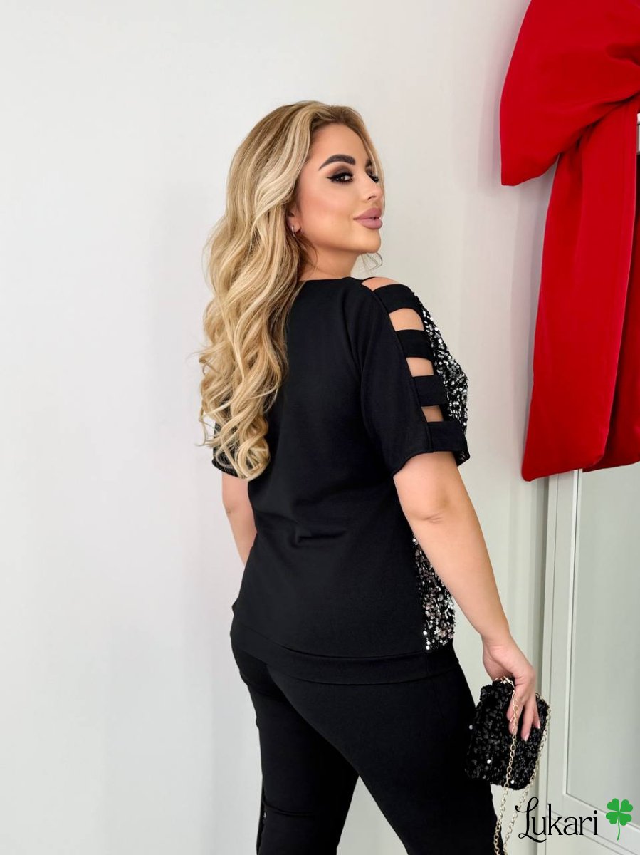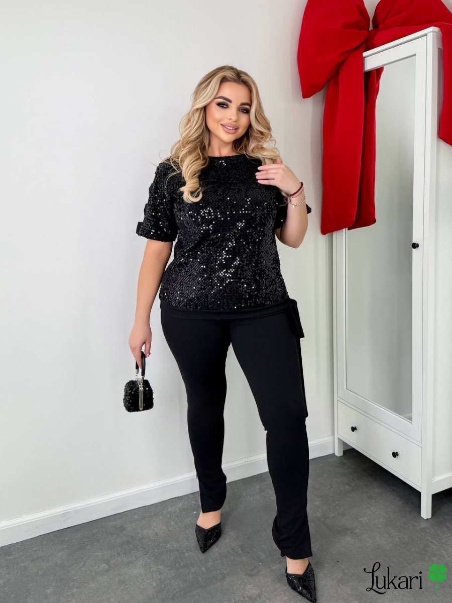 Верх із паєтками додає образу блиску та виразності, а штани з еластичного креп-дайвінгу ідеально сідають по фігурі, не сковуючи рухів. Декоративні блискавки внизу штанин додають сучасного стилю та візуально подовжують силует. Чорний колір робить костюм універсальним та легко комбінується з різним взуттям і аксесуарами.